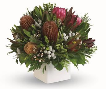 Flowers are subject to seasonal availability. In the event that any of the flowers are unavailable, the florist will substitute with a similar flower in the similar shape, style and colour. When native flowers are out of season, dried or preserved varieties are commonly used as replacements. Stem count, packaging and container may vary.