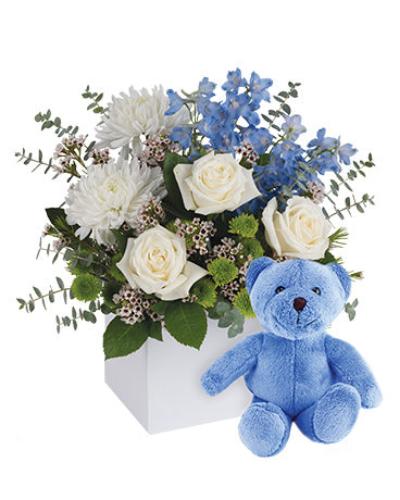 Celebrate the coolest baby boy’s arrival with this charming box arrangement that arrives chock full of flowers and a cute little keepsake friend.