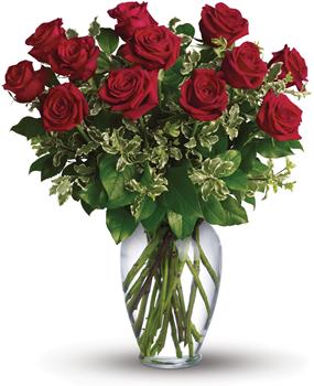 Arrangement of 12 Long Stemmed Red Roses in a Glass Vase