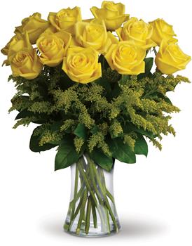 What a bright idea! Send a summery treat to someone special with this cheerful bouquet of one dozen yellow roses in complementing vase.