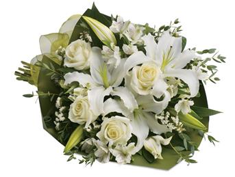 An elegant expression of sympathy, this wondrous white bouquet conveys purity and peace.