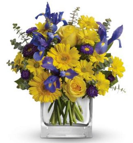 As invigorating as a cool summer breeze, this amazing arrangement pairs eye-catching iris with golden gerberas and roses for a sunny-day sensation. This arrangement comes in a glass cube vase.