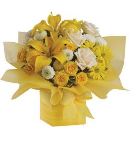 As refreshing as lemon sherbet, this sunny array of flowers in a yellow gift box tied with a matching ribbon makes a perfect gift for someone with taste. They’ll certainly admire yours.